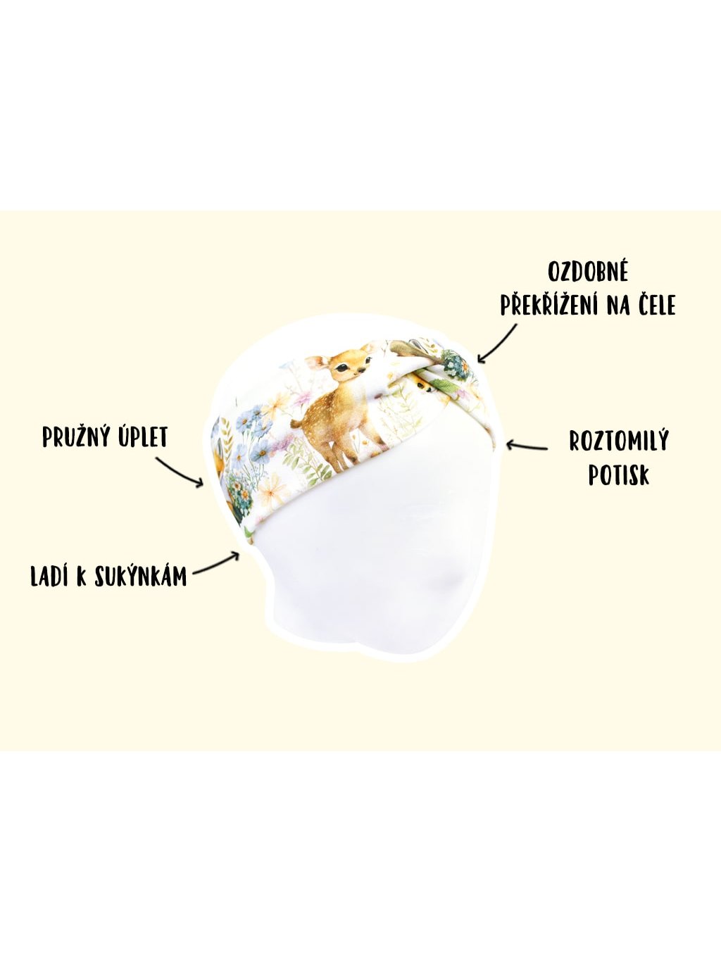 Dívčí čelenka s motivem roztomilých zvítátek na béžovém podkladu. Čelenka má uzel na čele a je vhodná pro všechny menší i větší holčičky. Největší velikost obléknou i dospělé ženy. Doporučujeme pečlivě měřit obvod hlavy - čelenky jsou šity z úpletu. Šev čelenky je na čelíčku. Čelenka je módní doplněk, ale hodí se i pro zakrytí oušek na jaře/podzim.