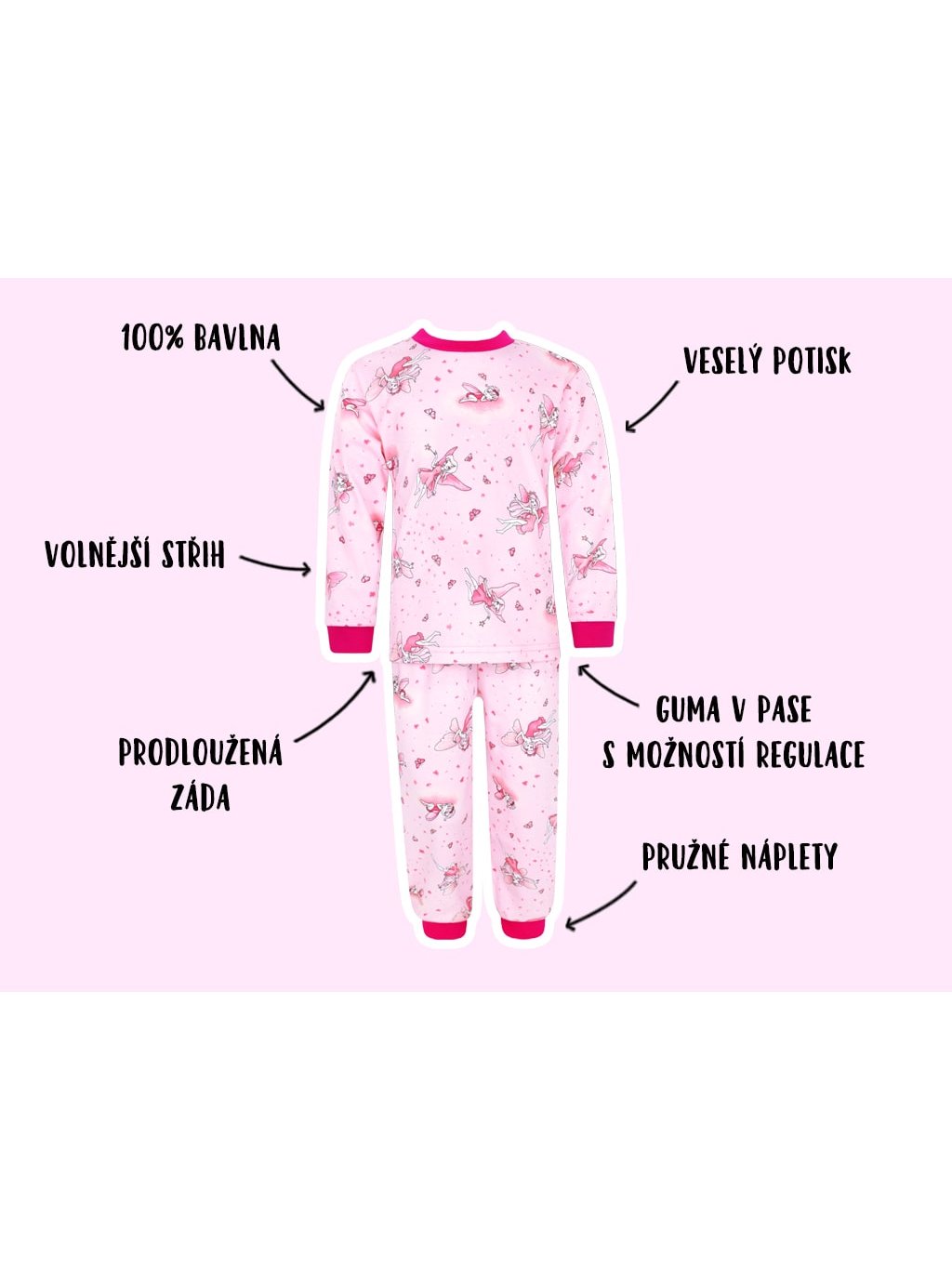 Bavlněné dívčí pyžamo s vílami na světle růžovém podkladu je doplněno tmavě růžovým nápletem (95% bavlna, 5% elastan) u krku a jako zakončení rukávů a nohavic. Pyžamko je ušito z příjemného 100% bavlněného oboulícního úpletu.