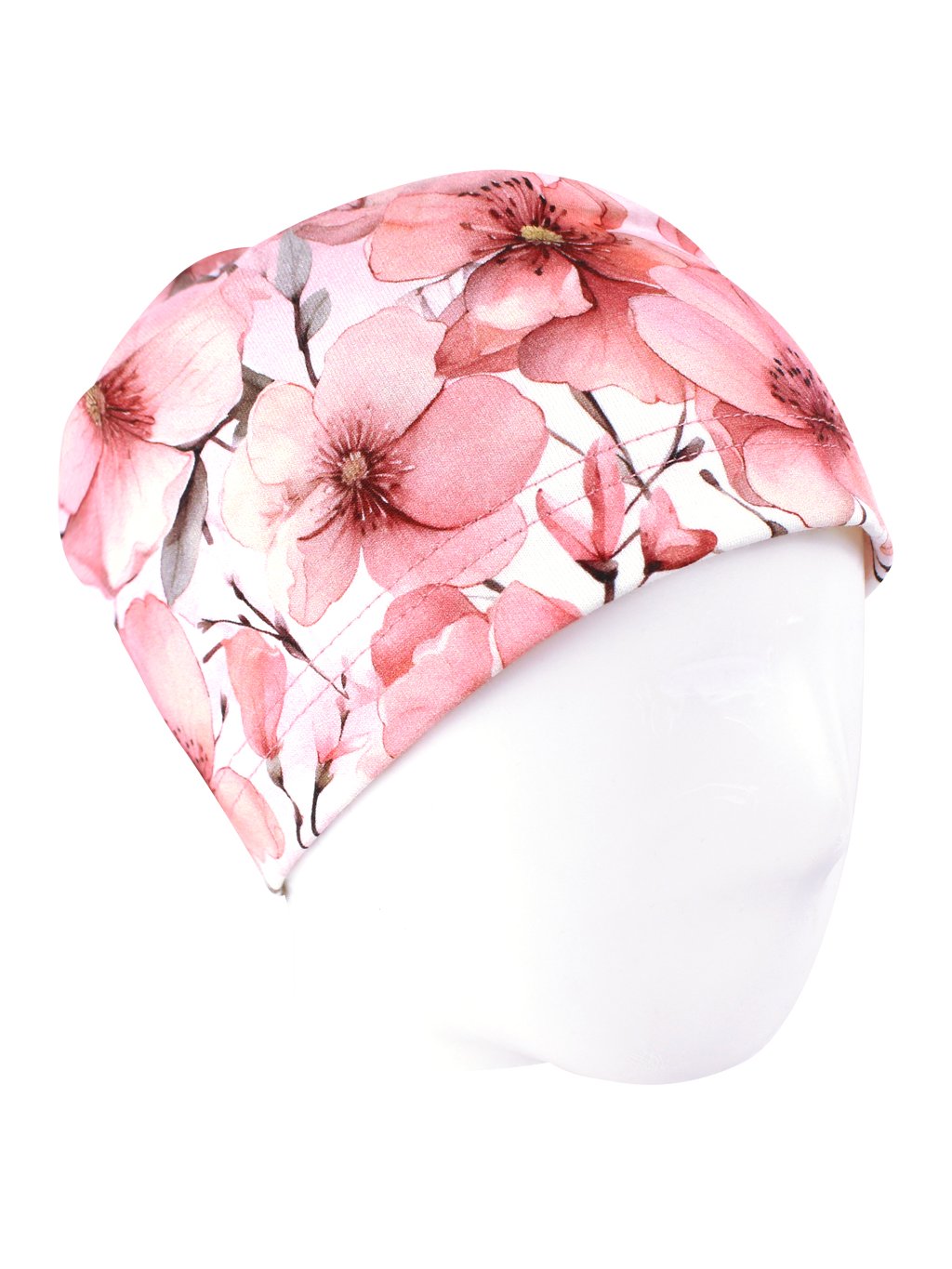 Dívčí jarní/podzímní čepice s motivem květin je šita ze slabší teplákoviny, hodí se tak zejména do teplejších dní. Čepice je spadlého střihu a je šita na obvod hlavičky, doporučujeme spíše menší velikost.