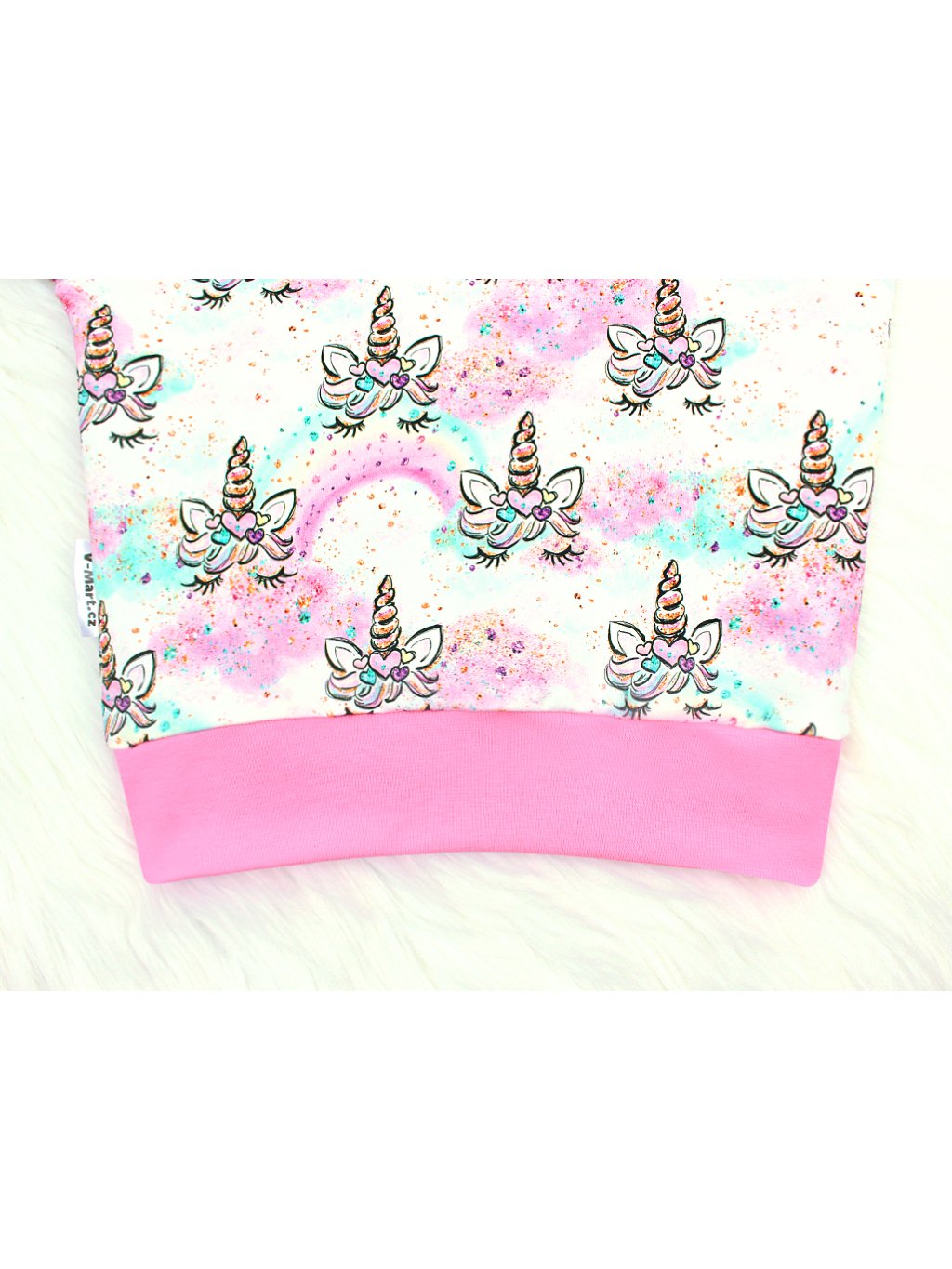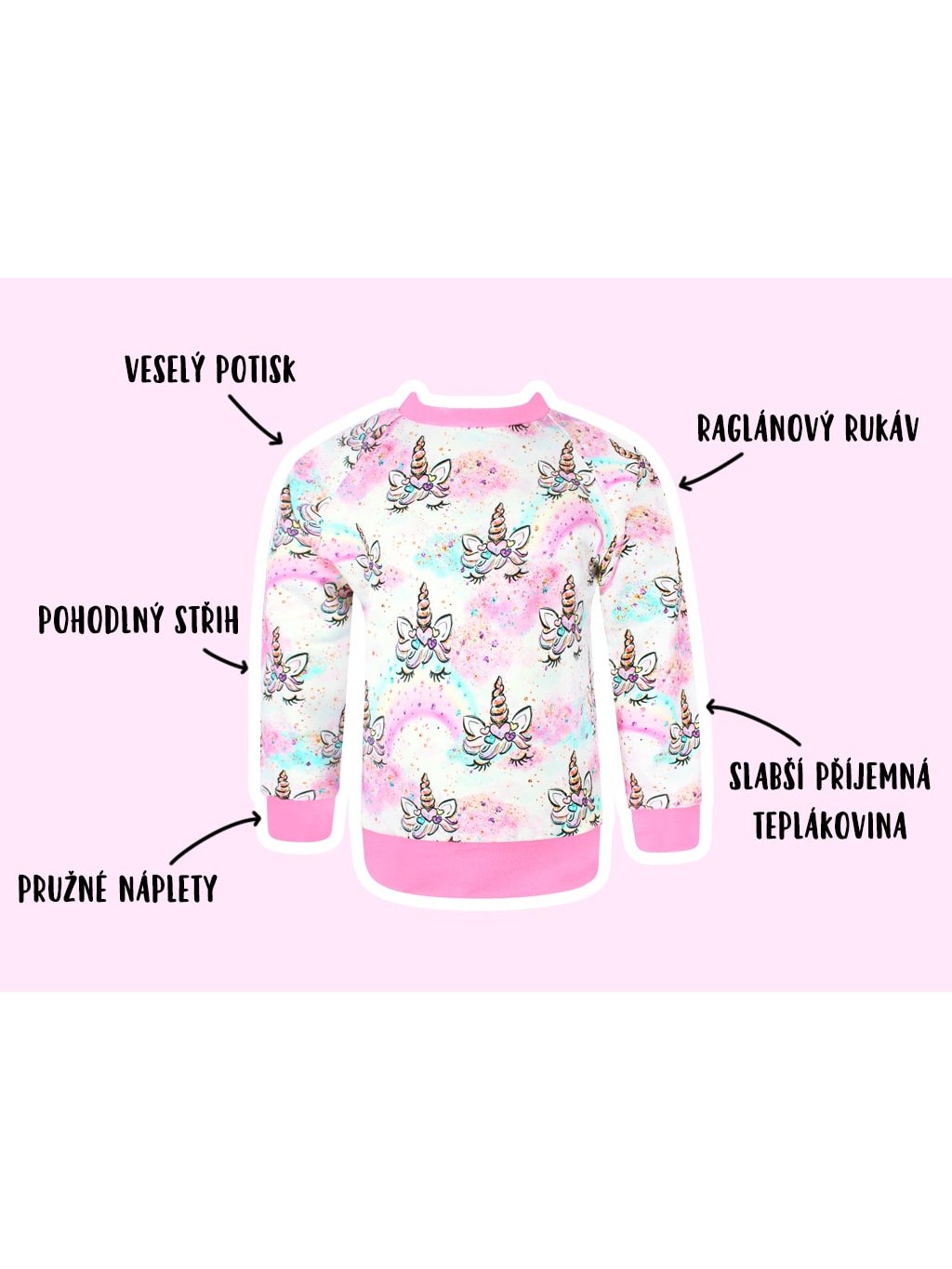 Dívčí mikina s potiskem jednorožčích očiček je vhodná pro malé i větší slečny. Je volnějšího střihu, s raglanovým rukávem, ušili jsme ji ze slabší pružné teplákoviny. V pase, rukávech a kolem krku je růžový náplet, který krásně pruží a drží mikinku na místě, zároveň drží teplo. Mikina je bez kapes.
