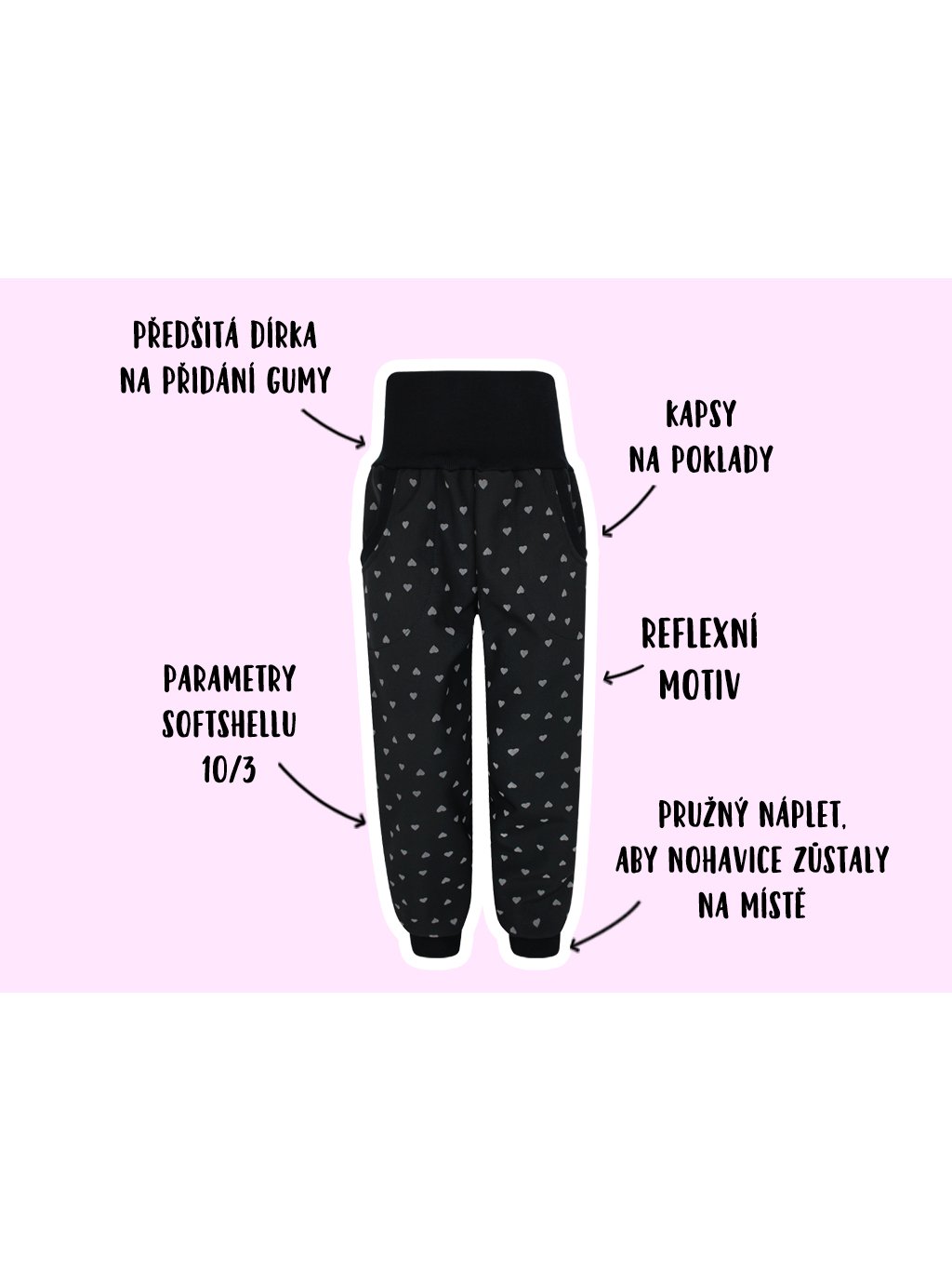 SLIM softshellové kalhoty Reflexní srdíčka (s fleecem) REFLEXNÉ SRDCIA