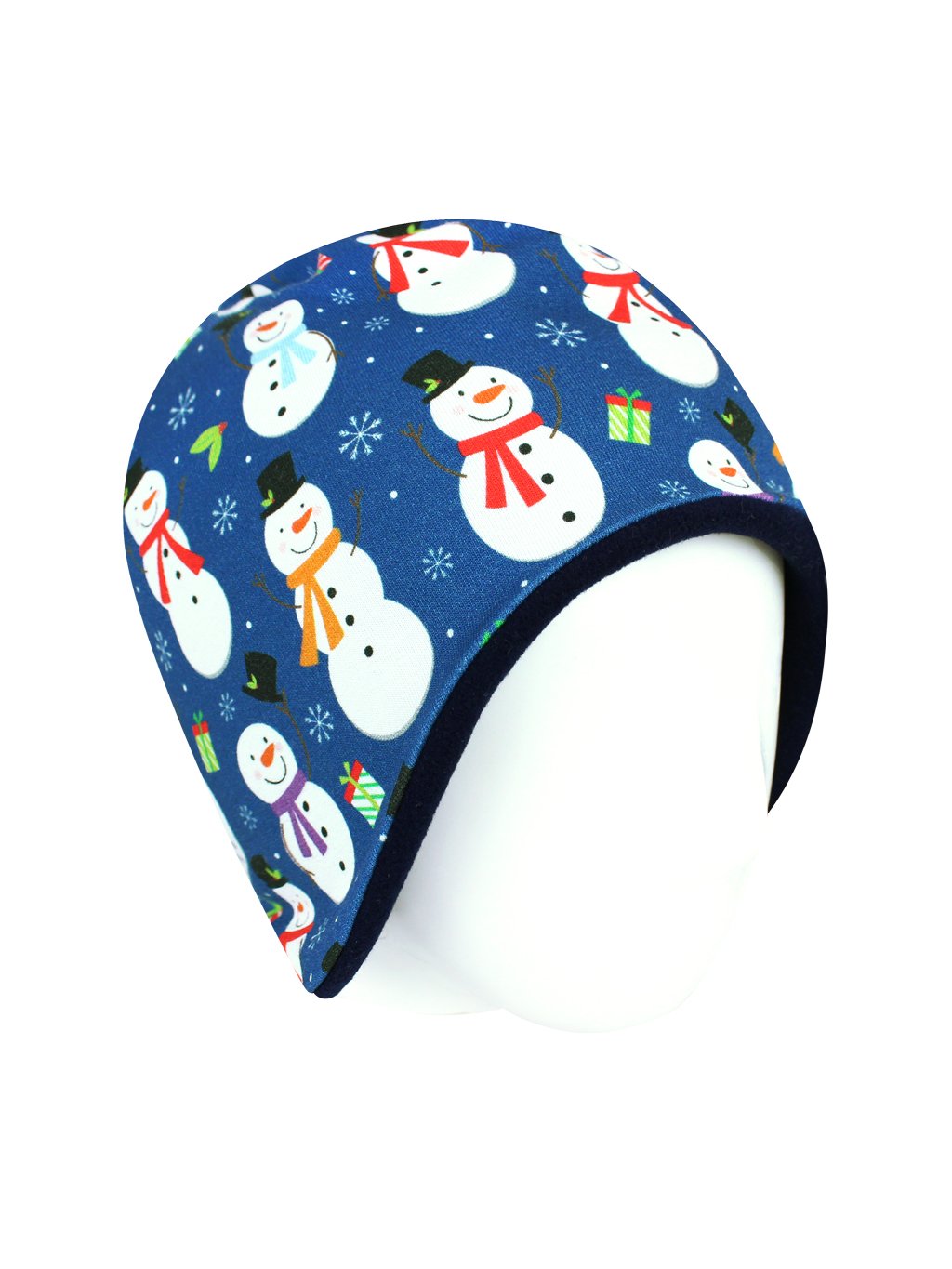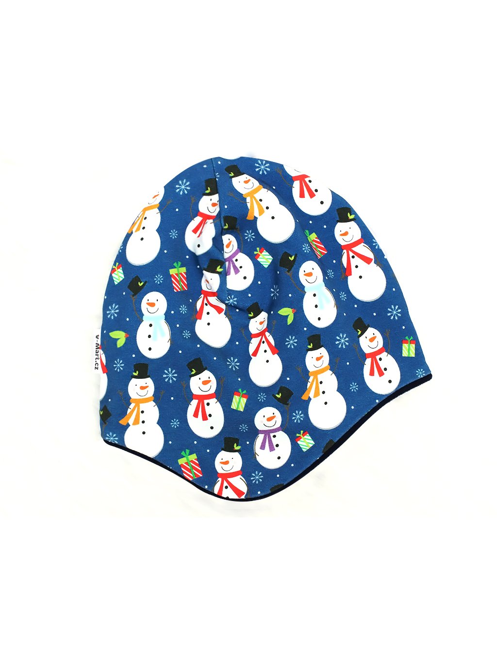 Čepice klasického střihu (není vzadu spadlá) s prodlouženými oušky je vhodná pro malé i větší děti. Tato se zimním motivem sněhuláků se bude líbit všem chlapečkům.  Čepice je dvouvrstvá, je podšita tmavě modrým fleecem - je velmi teplá, vhodná do zimního počasí. Čepice má prodloužená ouška, takže dětem neleze nahoru a mají stále zakryté uši.
